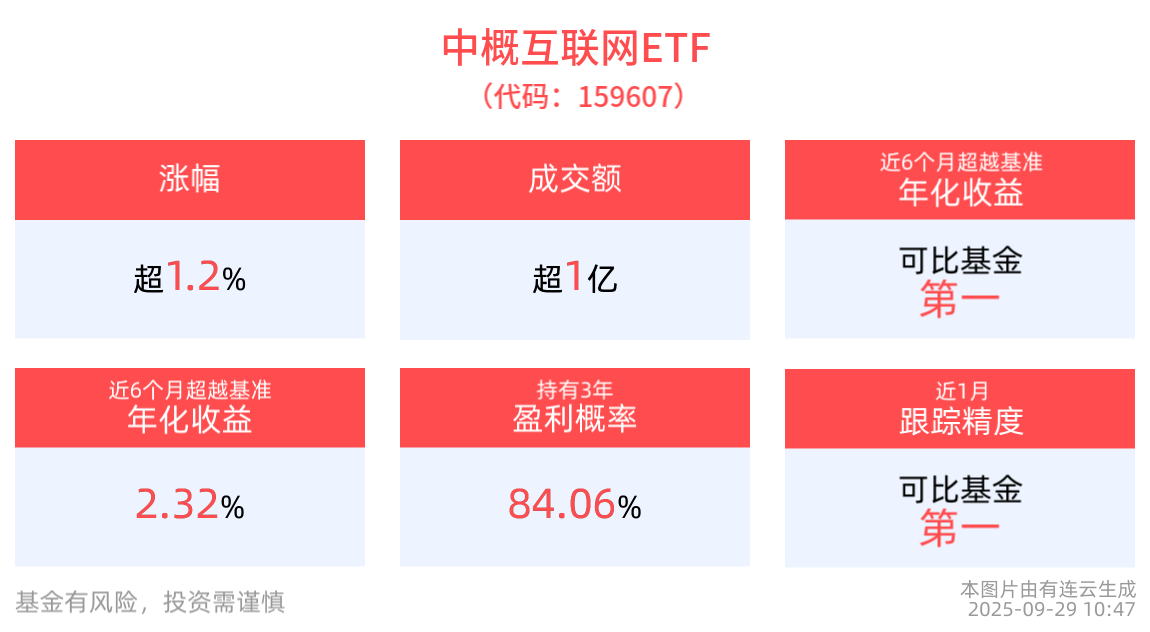 截至2025年9月29日 10:47,中概互联网ETF(159607)上涨1.28%。成分股方面,贝壳-W涨超4%,快手-W涨超4%,阿里巴巴-W涨超3%,哔哩哔哩-W涨超3%。流动性方面,中概互联网ETF盘中换手12.54%,成交1.43亿元,市场交投活跃。拉长时间看,截至9月26日,中概互联网ETF近1年日均成交3.62亿元。