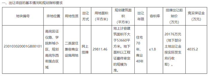 哈尔滨市自然资源和规划局近日发布公告,将以网上挂牌方式出让南岗区一宗国有建设用地使用权。该地块位于征仪路、学院新城小区和规划南岗东西街围合区域,出让面积29811.46平方米,起始价20176万元,计划于10月27日竞拍。