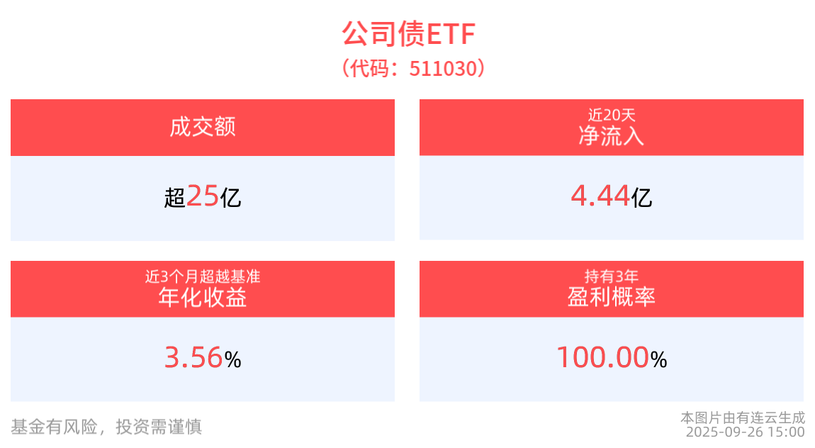 流动性方面,公司债ETF盘中换手11.05%,成交25.21亿元,市场交投活跃。拉长时间看,截至9月26日,公司债ETF近1月日均成交21.82亿元。