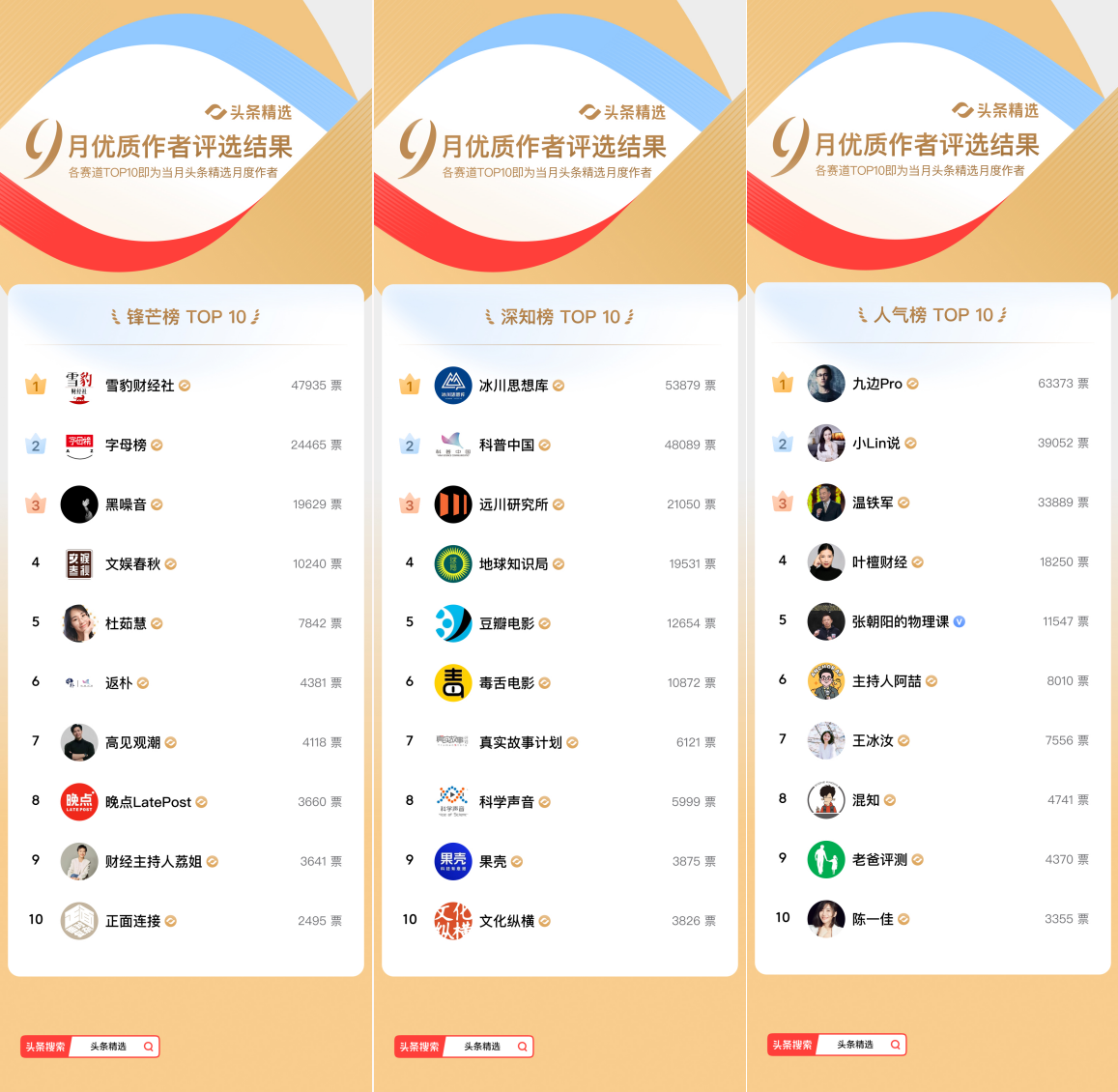9月11日,今日头条启动首届“头条精选-月度作者评选”活动,300位参赛者围绕各领域持续输出硬核内容,广大用户热情参与投票。@九边Pro 、@冰川思想库 、@雪豹财经社 等30位优质作者从300位参赛者中强势突围,其作品均以高专业性、强洞察力深受用户喜爱。