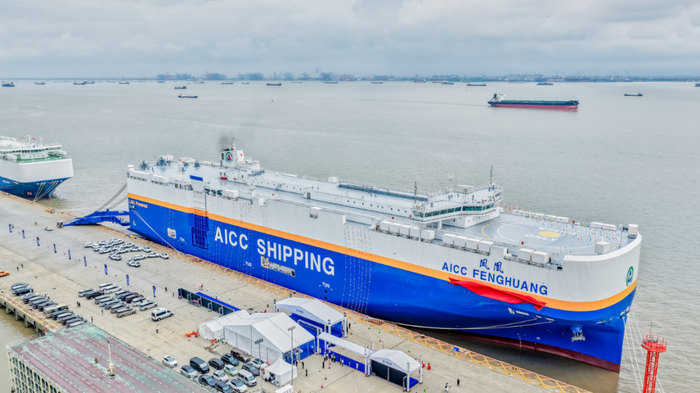 9月29日,安徽省港航集团旗下航瑞国际公司投资建造的首批7000车位LNG双燃料远洋滚装船3号船“凤凰”轮在上海海通国际汽车码头正式命名交付并开启首航,安徽国际远洋滚装运输船队规模进一步扩充。