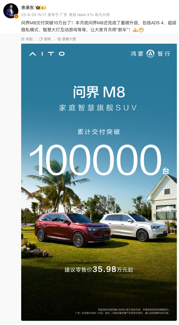 9月29日下午,华为常务董事、终端BG董事长余承东在社交平台发文透露,问界M8累计交付突破10万台。