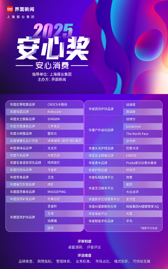 “安心奖”旨在表彰通过产品、服务与模式创新,为用户带来安全、可信消费体验的优秀品牌与企业。