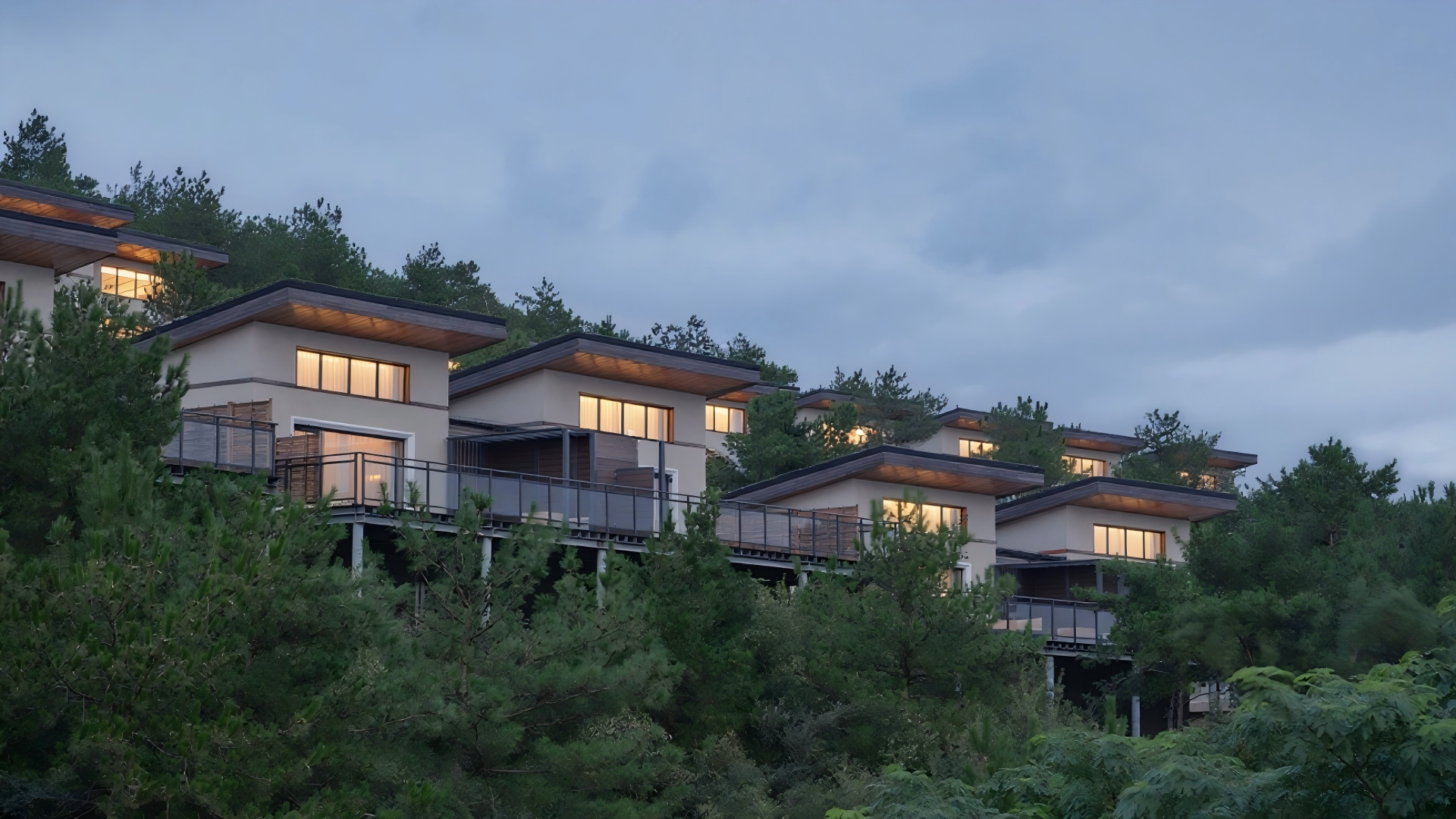 81栋独栋别墅依山就势错落排布,以“流动的雕塑”为灵感,呼应了兰博基尼超跑的流线美学,勾勒出标志性的建筑形象。