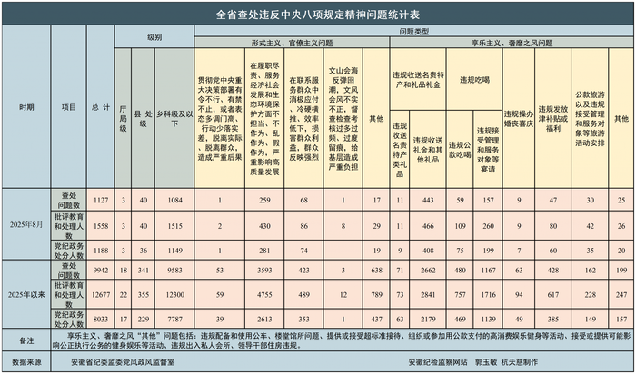 2025年8月,安徽全省纪检监察机关共查处违反中央八项规定精神问题1127起,批评教育和处理1558人,其中党纪政务处分1188人。