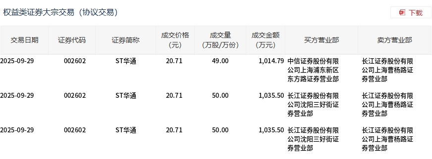 ST华通今日大宗交易折价成交149万股,成交额3085.79万元