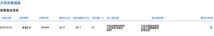 紫金矿业今日大宗交易平价成交10万股,成交额287.7万元