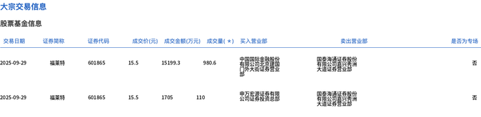 9月29日,福莱特大宗交易成交1090.6万股,成交额1.69亿元,占当日总成交额的36.68%,成交价15.5元,较市场收盘价17.05元折价9.09%。