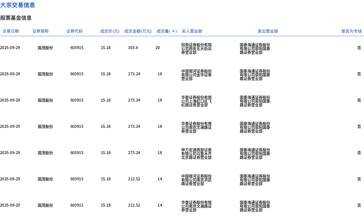 9月29日,国茂股份大宗交易成交120万股,成交额1821.6万元,占当日总成交额的9.15%,成交价15.18元,较市场收盘价17.22元折价11.85%。