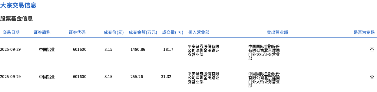 9月29日,中国铝业大宗交易成交213.02万股,成交额1736.12万元,占当日总成交额的0.44%,成交价8.15元,较市场收盘价8.15元持平。
