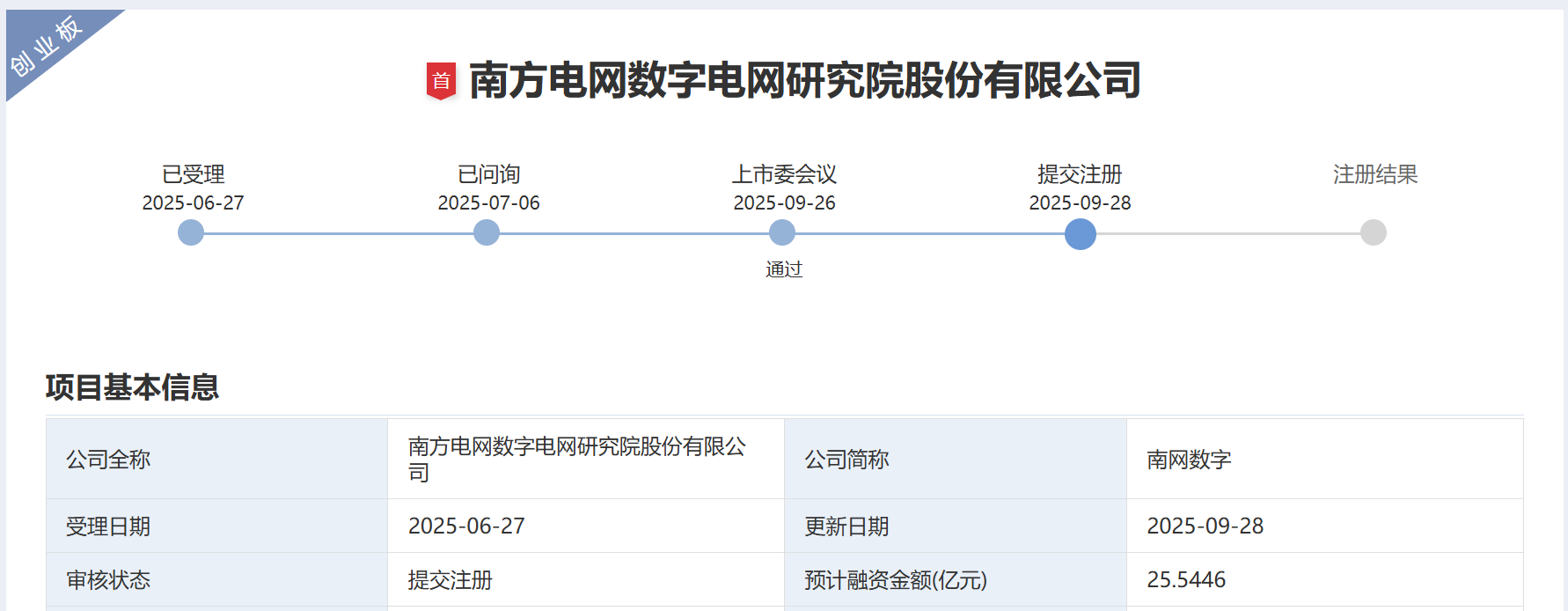 9月28日,南网数字提交了在创业板上市的注册稿,距离该公司6月27日IPO申请被深交所受理仅过去三个月,距离成功IPO仅一步之遥。