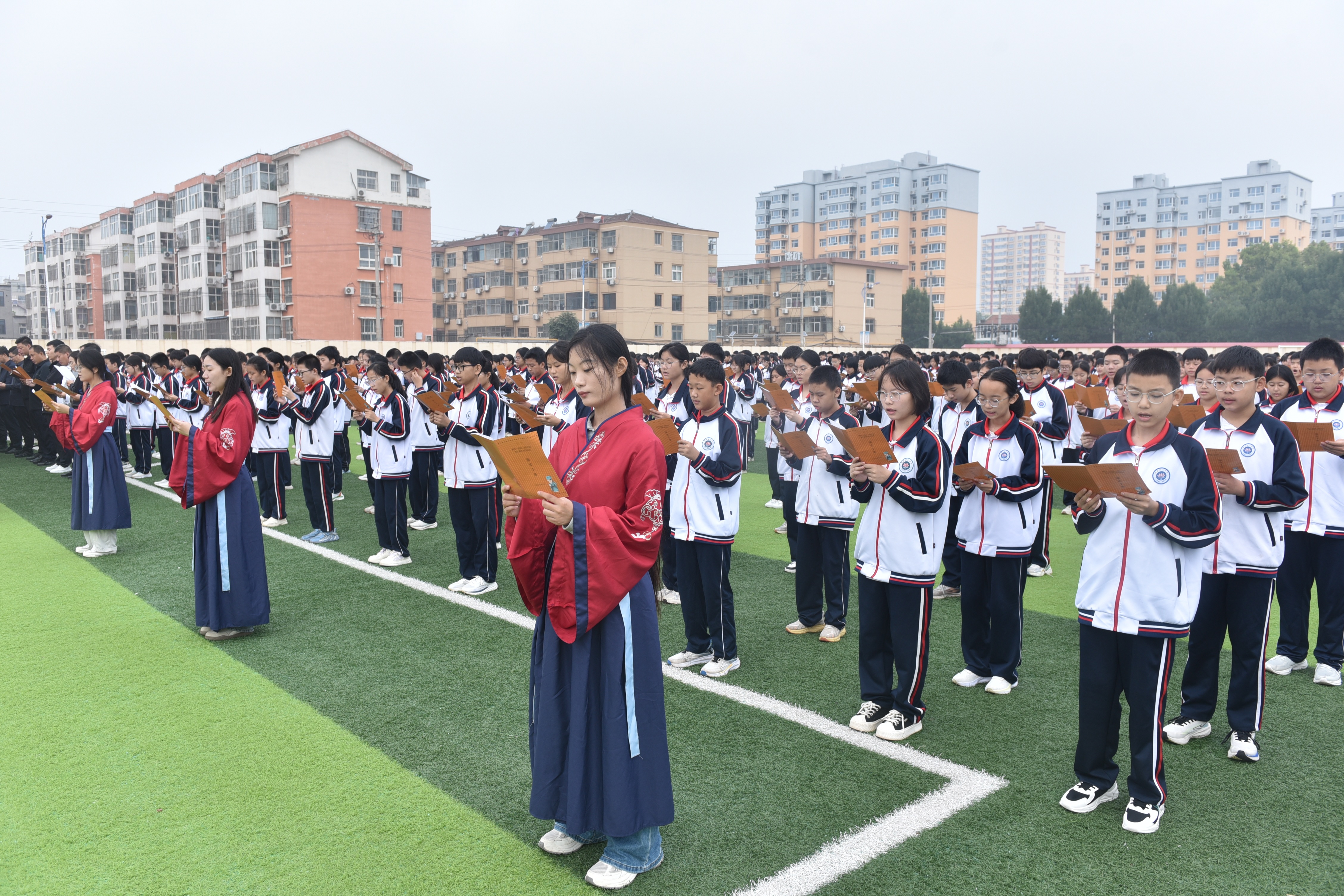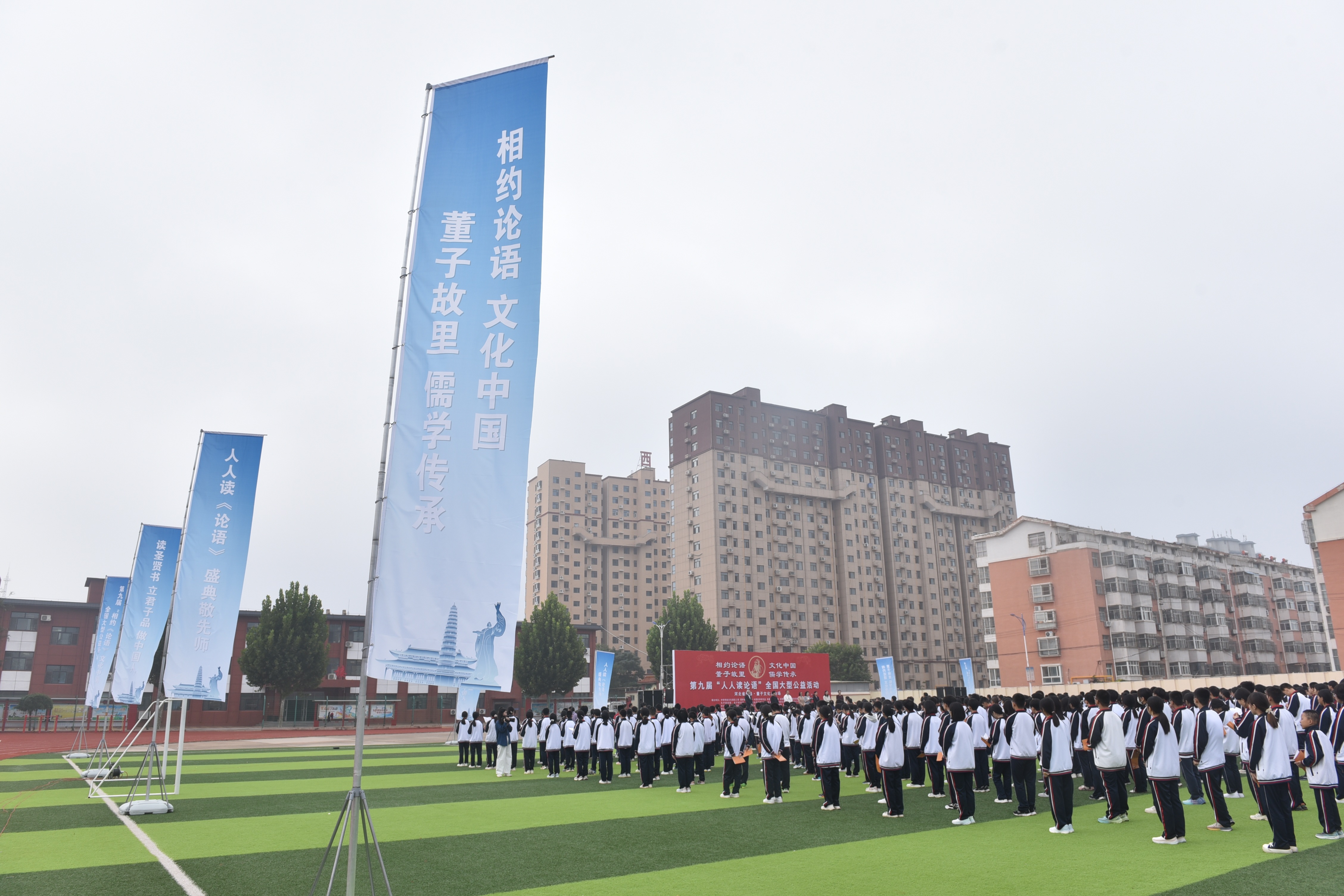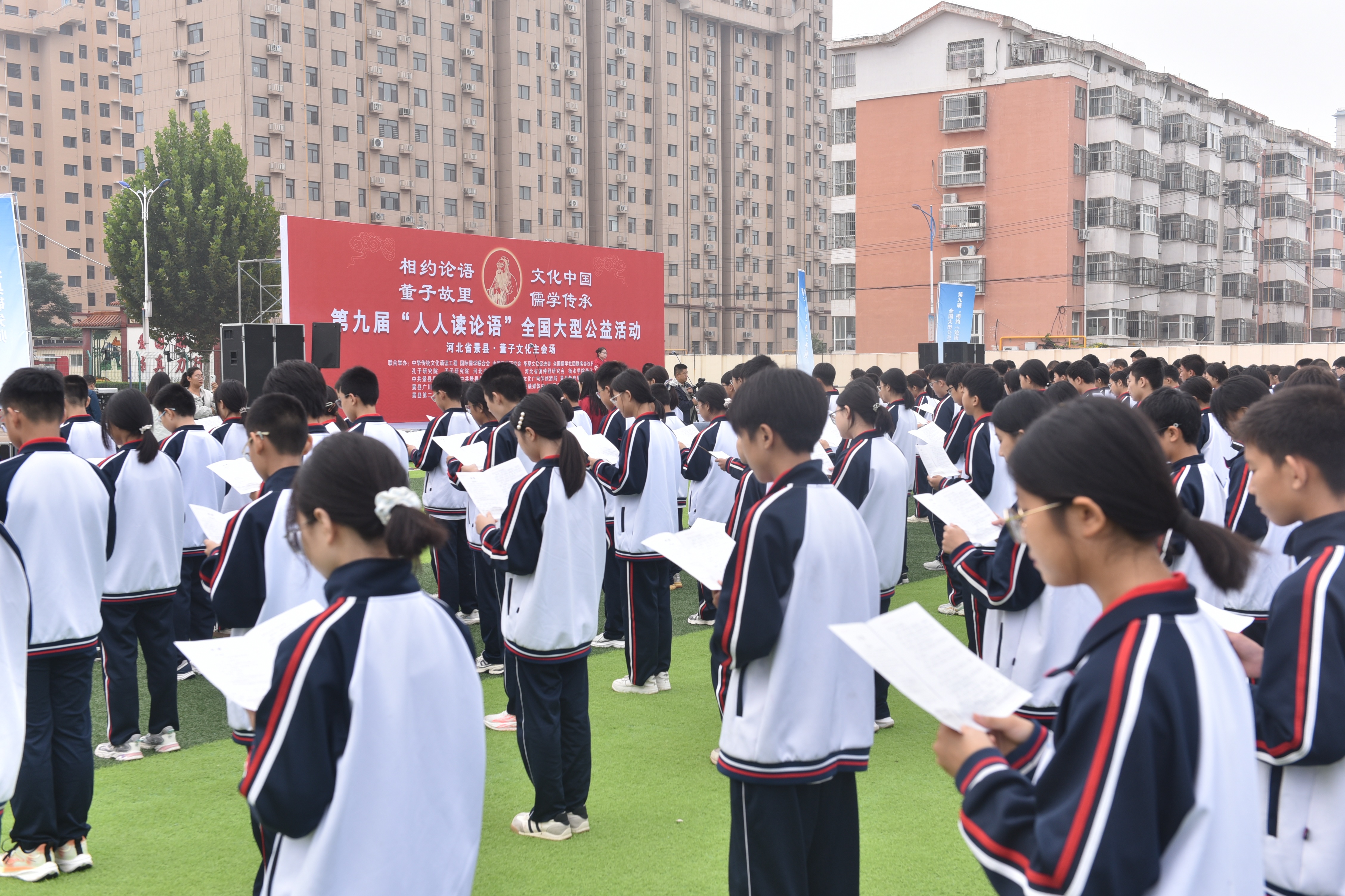 “士不可以不弘毅,任重而道远。”“温故而知新,可以为师矣。”……在活动主会场景县第二中学的操场上,3000余名师生齐声诵读《论语》经典篇章与董子语录,抑扬顿挫、铿锵有力的诵读声响彻校园上空,久久回荡。同时,景县任重完全小学、第二完全小学、第五完全小学、第三中学、景州镇联小等学校作为分会场同步开展诵读,更有企业职工代表踊跃参与,总人数达近万人。