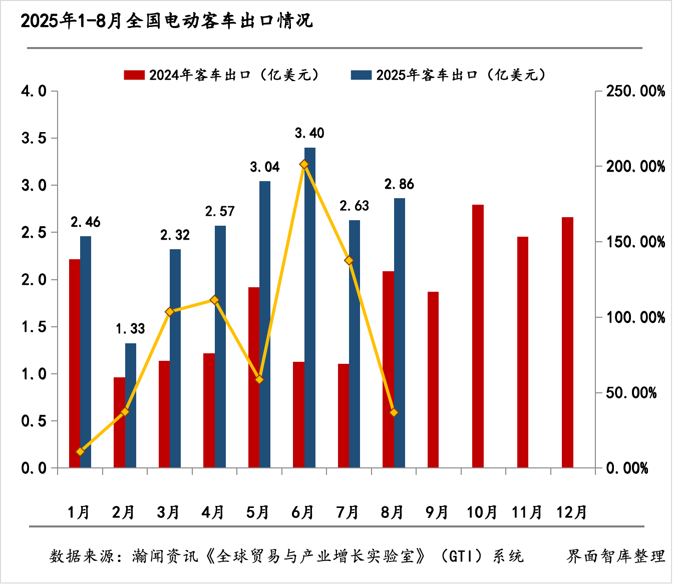 从细分品类看,纯电动客车是客车出口的绝对主力。8月纯电动客车出口数量达1294辆,同比增长2.13%,环比下降5.27%;均价为208713.88美元,同比增长32.93% ,环比增长8.37%。而混合动力客车8月出口数量达100辆,同比增长35.14%,但环比大幅增长566.67%;均价为154571.70美元,同比增长13.96%,环比增幅飙升至981.12%。