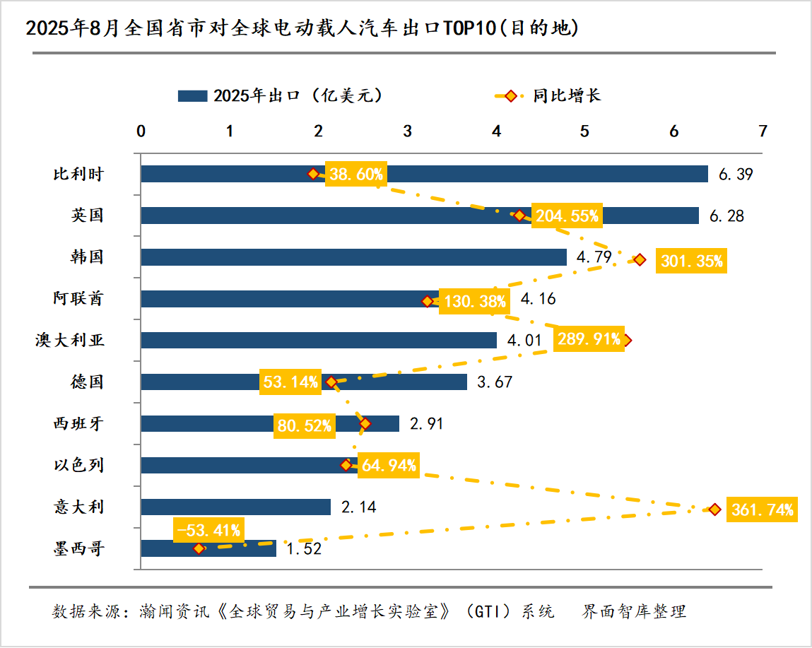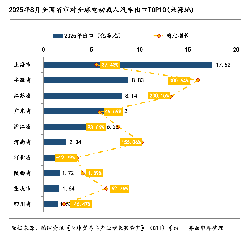 【编者按】为了更全面、更及时、更精确地反映电动载人汽车出口状况,2025年3月起,界面新闻/界面智库和瀚闻资讯联合推出《中国电动载人汽车出海月报》。《中国电动载人汽车出海月报》旨在呈现全国及各省电动载人汽车出口金额、出口数量和出口目的地等指标的月度变化趋势,以期为政府、企业和投资者等提供决策参考。我们将于每月27日左右发布相关月报。