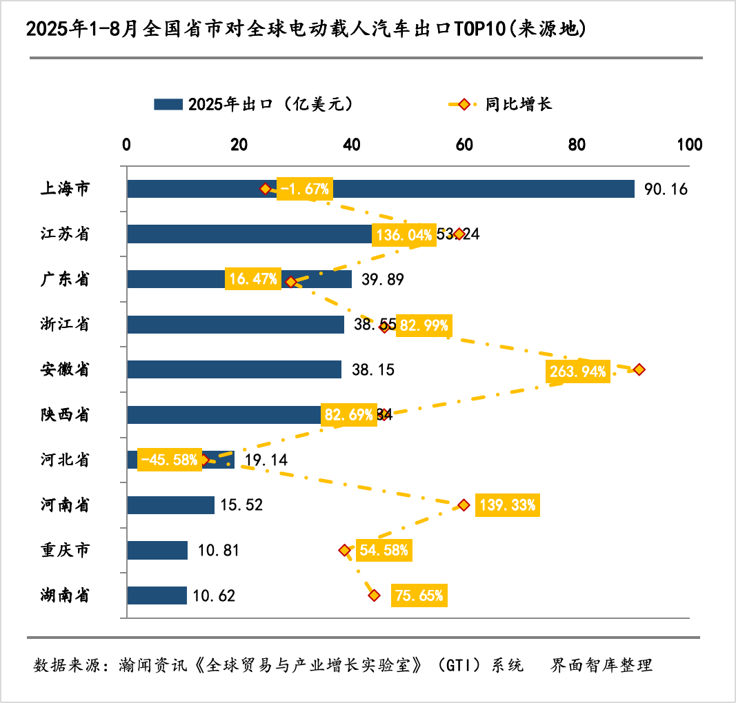 1-8月,上海市以90.16亿美元的出口额继续领跑全国电动载人汽车出口,但同比小幅下滑1.67%。江苏省以53.24亿美元稳居第二,并实现136.04%的爆发式增长,增速显著。广东省位列第三,出口额为39.89亿美元,同比增长16.47%。1-8月TOP10来源地出口金额合计达352.88亿美元,占全国电动载人汽车总出口额的85.89%,头部省市的主导格局稳固。