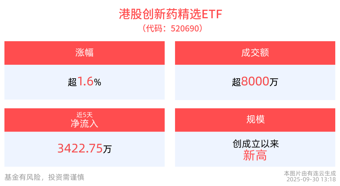 流动性方面,港股创新药精选ETF盘中换手19.21%,成交8358.86万元,市场交投活跃。拉长时间看,截至9月29日,港股创新药精选ETF近1月日均成交1.60亿元。