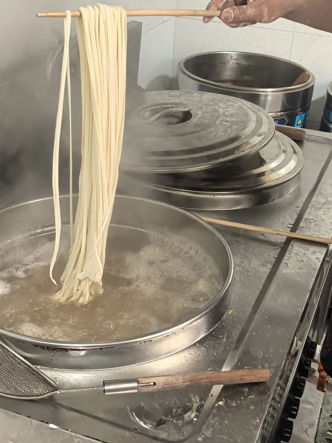 煮面决定着最后的成败,想要拥有劲道弹牙的口感,煮面要求水宽火旺,水烧至沸腾翻滚即可下面。加长的筷子在汤中不停搅动,根据不同口感适时捞出。