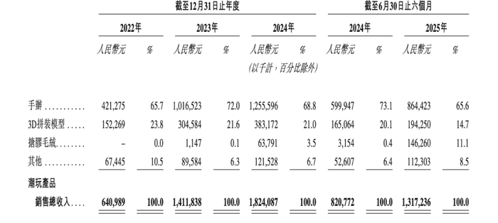 手办是首要主力,2024年该品类收入为12.56亿元,占比68.8%,同比增速超23%。