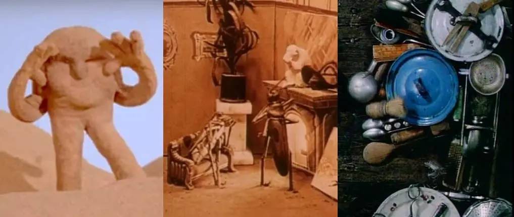 定格动画的材料确实有着多样的形态,譬如考·浩德曼(Co Hoedeman)《沙堡》(The Sand Castle)里的沙、拉迪斯洛夫·斯塔列维奇(Wladyslaw Starewicz)《摄影师的复仇》(The Cameraman'sRevenge)里的虫偶,以及扬·史云梅耶(Jan Svankmajer)《对话的维度》(Dimensions of Dialogue)里那些更加光怪陆离的综合材料等等。