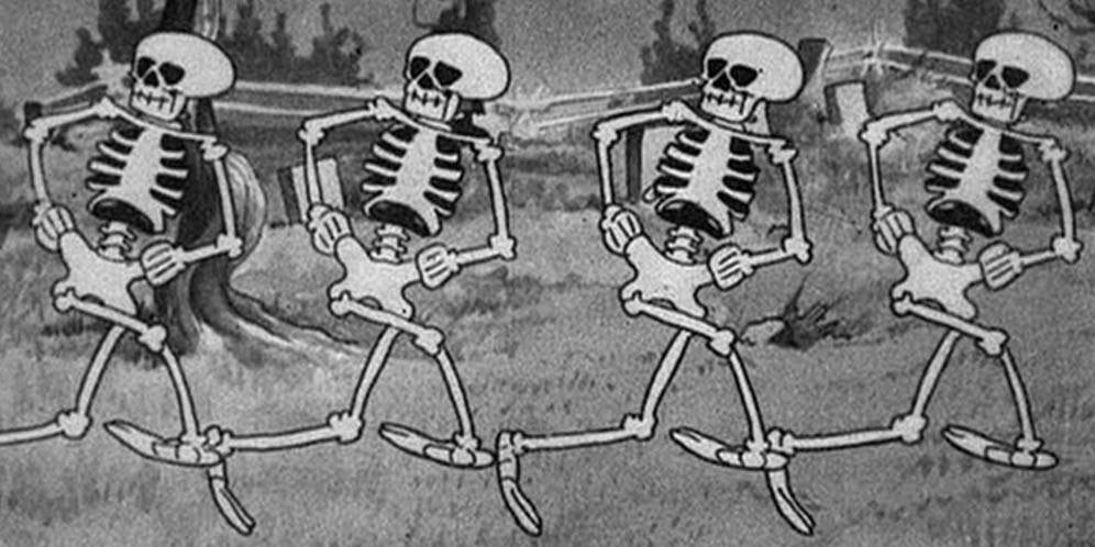 须强调的是,很多动画的材料虽然可见,却是难以辨认的。就比如那些古旧而经典的赛璐珞动画。在看《骷髅之舞》(The Skeleton Dance)时,我们只看到疯狂恣意的骷髅架子们上演着一出热闹非凡的黑色喜剧,却看不到什么绘画上的颜料特质。映入我们眼帘的骷髅不外乎由单纯的线条、色彩等构形而成的具体动画形象。换句话讲,在普通观众眼里,它们只是“骷髅”,却很难作为“用颜料画在赛璐珞片上的骷髅”。所谓“单线平涂”的风格,大致如此。