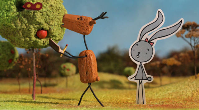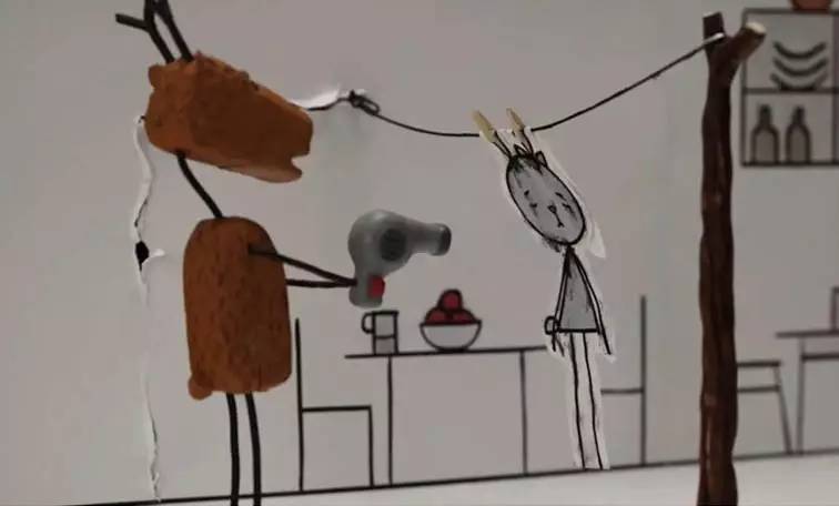 如果这时候再回过头去看《超级无敌掌门狗》(Wallace and Gromit)系列或者《小羊肖恩》(Shaun the Sheep)系列等,就不难发现,我们“虽然可以从视觉风格上辨识出材料的种类,却无法在角色和故事中感受到材料的性格”[4]。这些定格动画虽然妙趣横生、令人捧腹,但趣味却不是源于材料,或者说材料几乎没能参与到故事的内核中去。相反,《平面世界》、《兔与鹿》等作品却让材料真正开口讲起了故事。