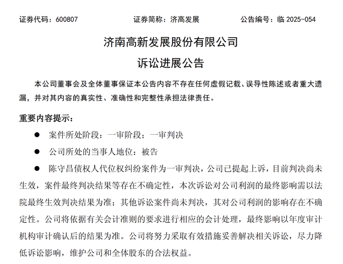 据上交所官网,2025年9月29日,济高发展连发多份公告披露,公司涉及三起债权人代位权纠纷诉讼进展。据公司《关于诉讼进展的公告》显示,其中最为突出的陈守昌案已获一审判决,济南市章丘区人民法院判决济高发展向陈守昌支付工程款572万元及利息、费用。