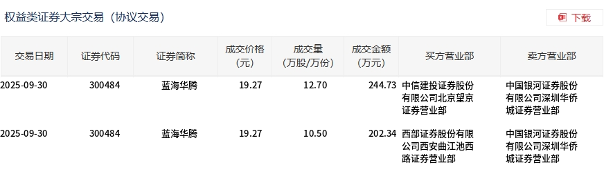 蓝海华腾今日大宗交易折价成交23.2万股,成交额447.07万元