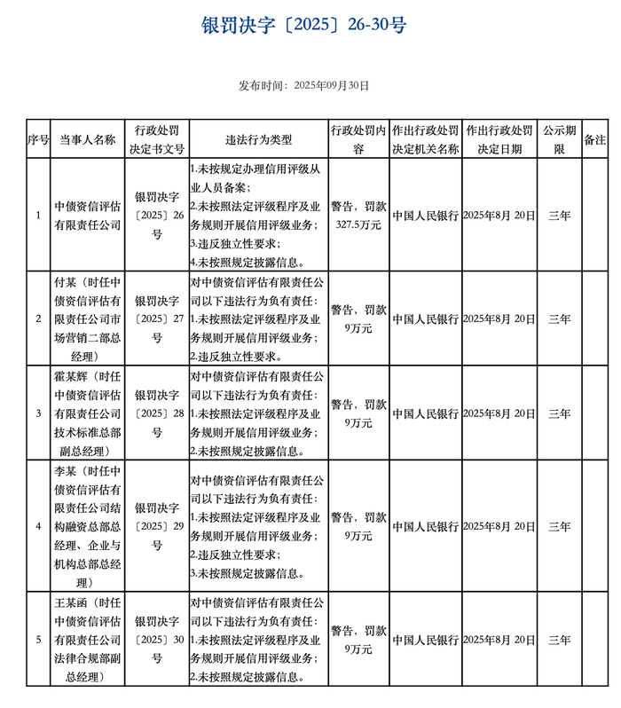9月30日,央行行政处罚公示信息显示,因涉及四项违法行为,中债资信评估有限责任公司被警告,并被罚款327.5万元,违法行为类型包括:未按规定办理信用评级从业人员备案;未按照法定评级程序及业务规则开展信用评级业务;违反独立性要求;未按照规定披露信息等。