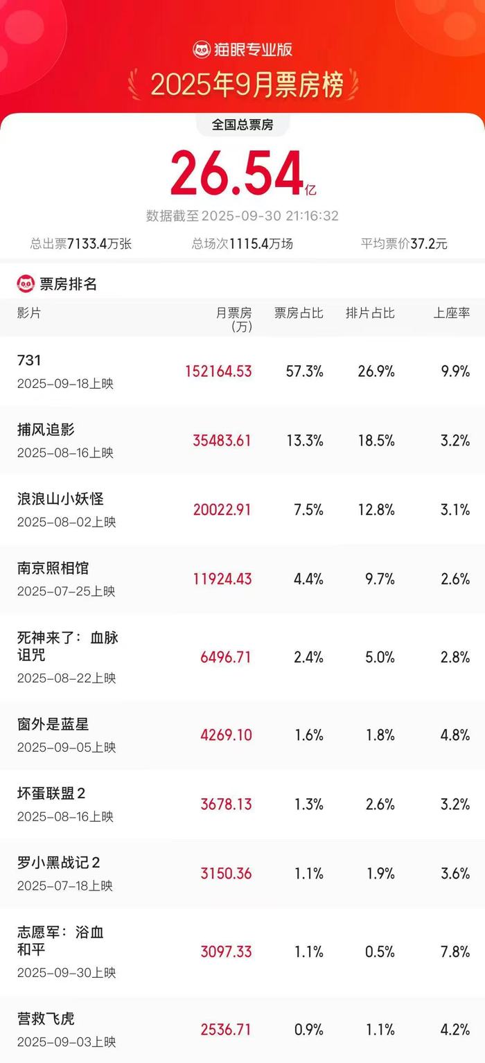 据猫眼专业版数据,截至9月30日21时,2025年9月总票房26.54亿,总人次7133.4万,总场次1115.4万,《731》成中国影史9月票房冠军。9月票房TOP5分别为:《731》《捕风追影》《浪浪山小妖怪》《南京照相馆》《死神来了:血脉诅咒》 。