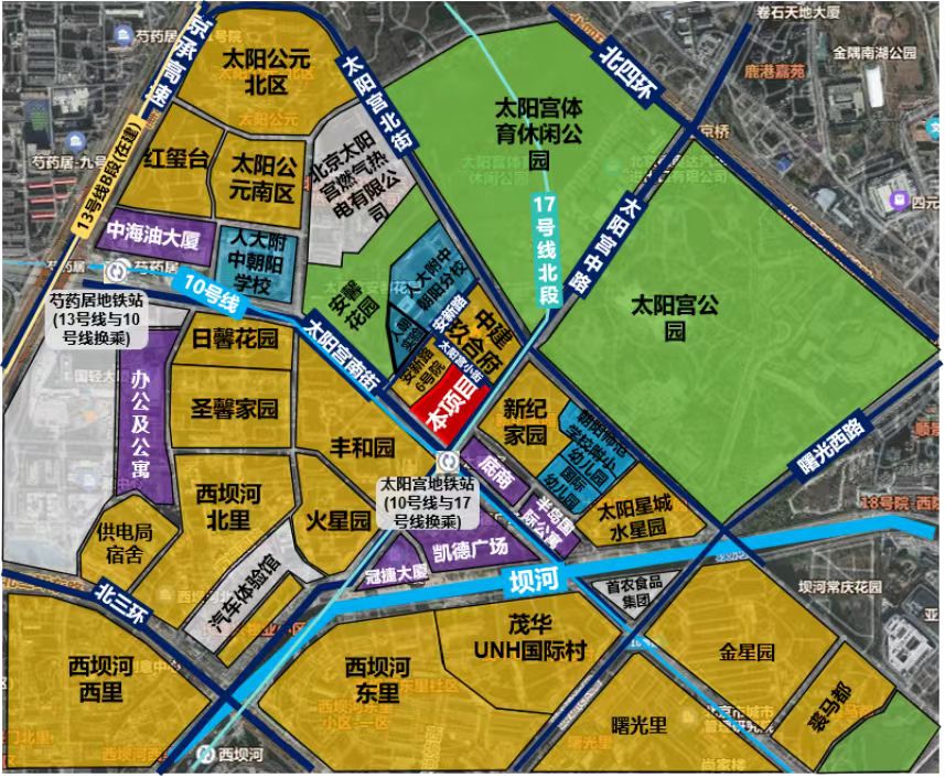 该地块交通条件优越,可无缝衔接地铁10号线与17号线太阳宫站,规划中更要求地下空间与地铁站厅直接连通,实现“出小区即进地铁”的高效通勤体验。周边配套成熟,西侧紧邻凯德MALL大型商业综合体,步行可达太阳宫公园,并享有人大附中朝阳学校等优质教育资源。