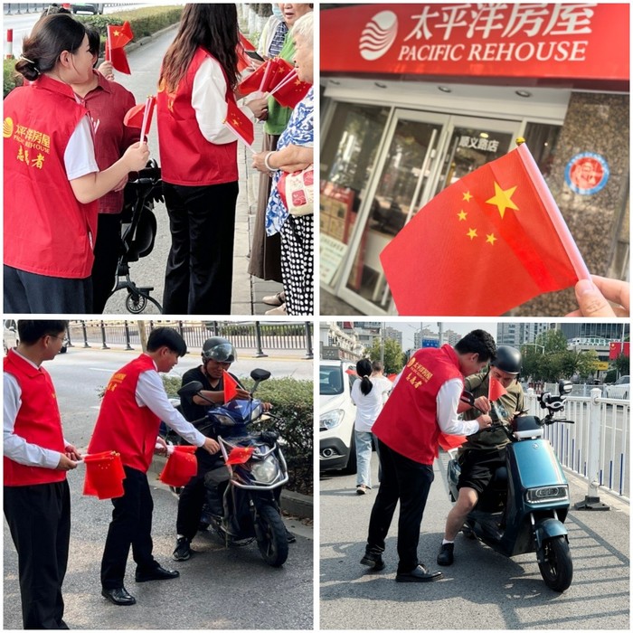 秋日阳光下的上海,节日的氛围格外浓烈。从清晨开始,在长寿路、徐家汇、陆家嘴等繁华商圈,在田林、康健、联洋等居民社区,以及在四通八达的交通枢纽,都能看到身着统一服装的太平洋房屋志愿者。他们手持一束束鲜艳的五星红旗,微笑着向过往市民分发。