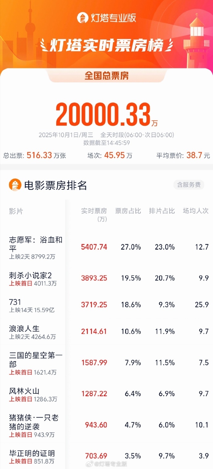 据灯塔专业版,截至10月1日14时46分,2025年国庆档首日(10月1日国庆节)票房突破2亿。