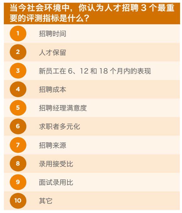 越来越多的招聘人员通过评估新员工的长期表现,以评估招聘工作的绩效。光辉睿程通过对全球1100多名招聘负责人进行调查发现,大中华区受访者表示,招聘时间是评估招聘人员绩效最首要的指标,紧随其后的是人才保留以及入职新员工在6、12和18个月内的绩效表现。