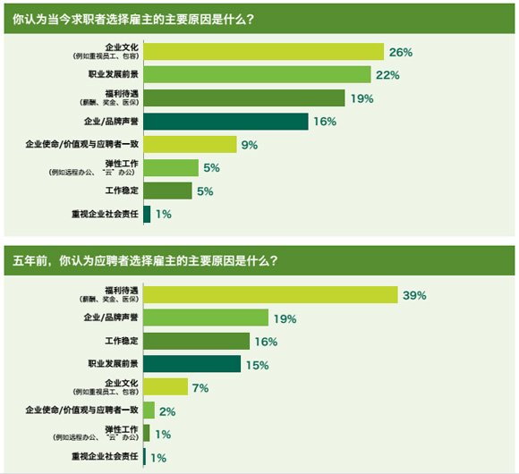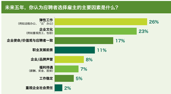 “企业文化”是当今应聘者选择雇主的最主要因素,这与五年前截然不同,当时的招聘人员表示“福利待遇”是应聘者最优先考虑的因素。而预计五年后,“弹性工作”将成为应聘者挑选岗位时最看重的因素。