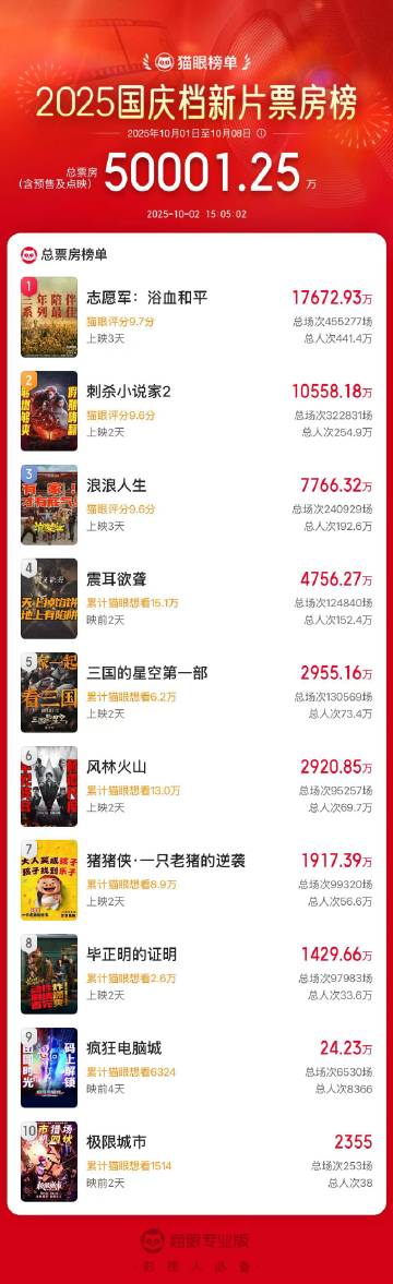 据猫眼专业版数据,2025国庆档新片总票房突破5亿,《志愿军:浴血和平》《刺杀小说家2》《浪浪人生》分列前三位。