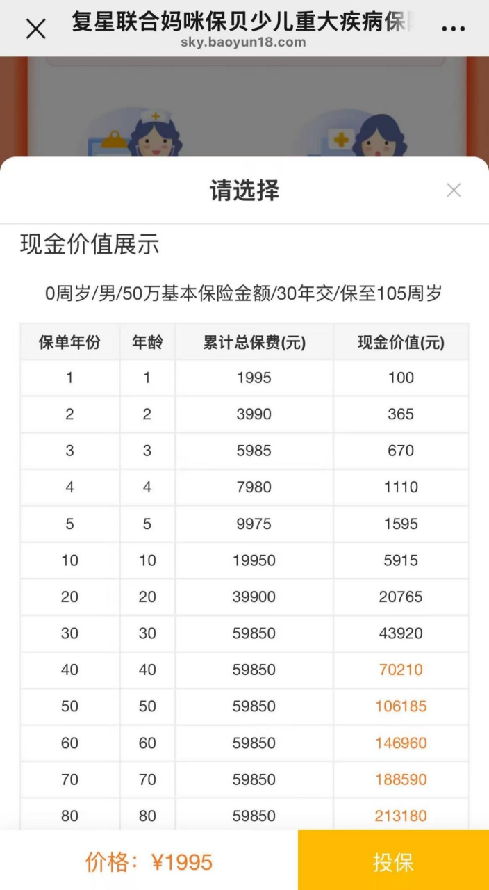 根据产品现金价值展示,为0岁男孩购买“妈咪保贝”,选择保至终身,50万保额、30年缴费,每年保费只有1995元,如果附加了重大疾病二次赔付+少儿特定及罕见疾病额外赔付,每年保费为2530元。