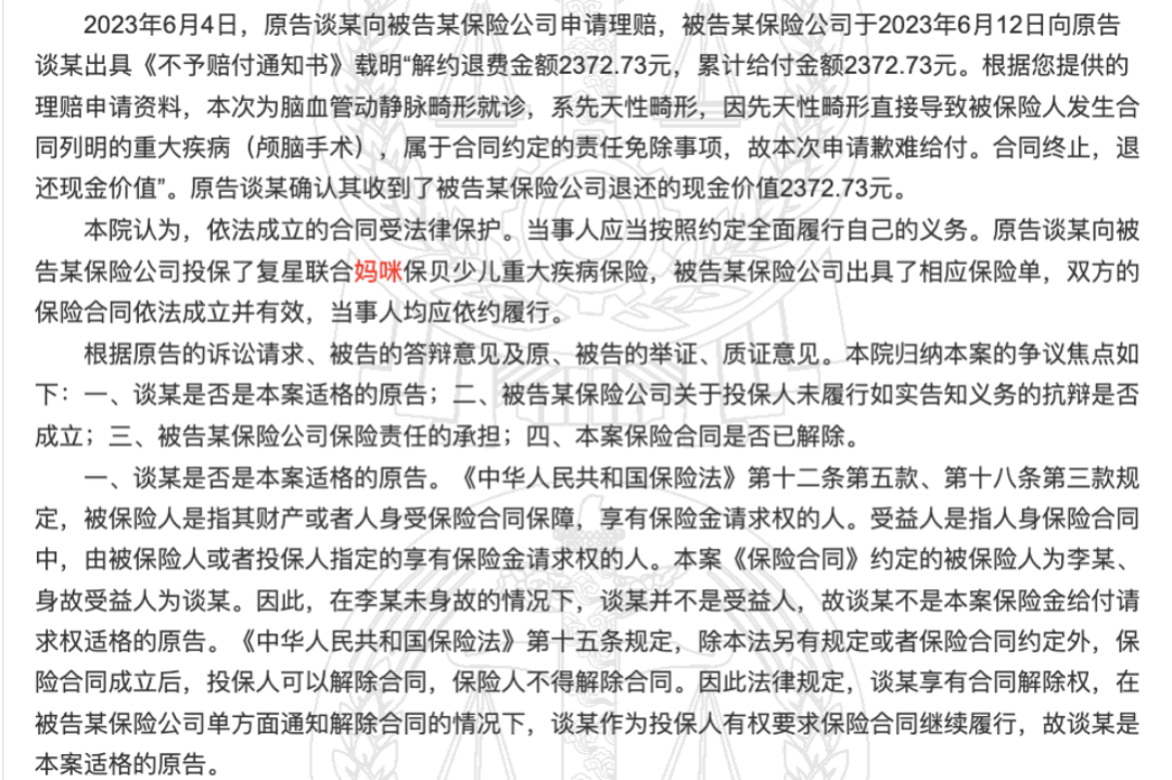 然而这款高性价比的热销重疾险,却让复星联合健康多次因“拒赔”被投保人告上法庭。裁判文书网上检索“复星联合妈咪宝贝”这一关键词,有19篇相关文书。每一篇背后,是一个家庭与保险公司的博弈。