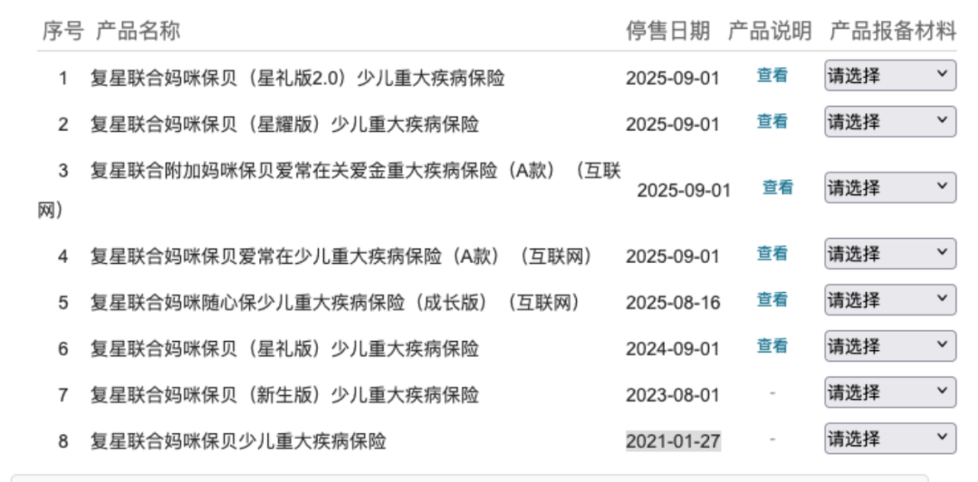 复星联合健康官网显示,“妈咪保贝”于2021年1月27日已停售,且其他多款“妈咪保贝系列”产品,也均已停售。
