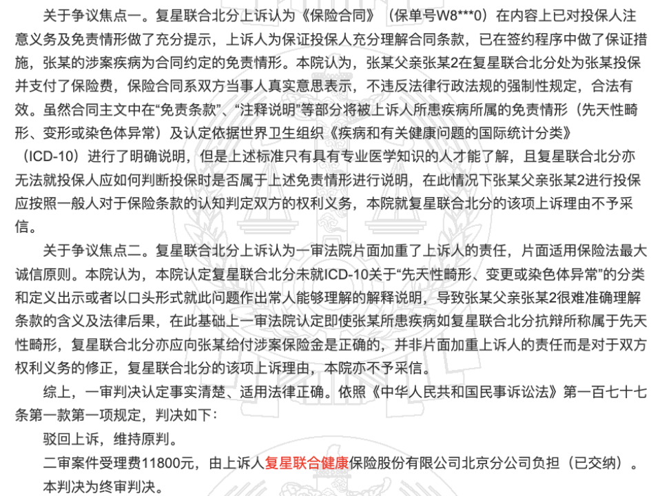 一审法院最终判决复星联合健康北京分院败诉,需向张某支付重大疾病保险金79.25万元;二审维持原判,案件受理费1.18万元,由复星联合健康北京分公司负担。