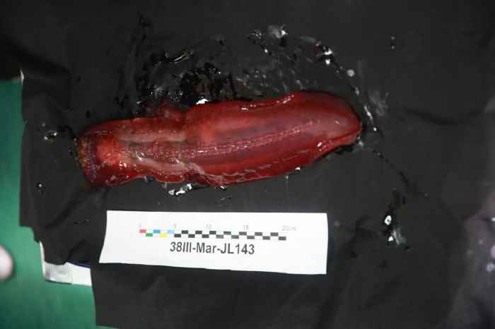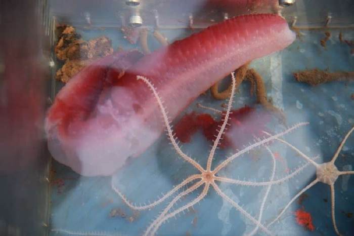 唐嘉陵介绍,今天运气很好,抓到了一只35公分左右的海参。当“蛟龙”快要到达4800米海底时,看到了一只红色巨型海参。不过它对“蛟龙”的到来并不欢迎,还没等潜水器坐底,它就溜走了,逃跑的姿势是S型,像跳舞一样。半小时后,唐嘉陵又看到了一只同样的海参,“这次不能让它溜掉。”唐嘉陵说,“我迅速打开‘龙爪’轻轻抓住了它,但因体型较大,机械手并不能完全握住它,它不断挣扎想要逃跑,当我要把他放进采样筐时,海参挣脱出来却跑错了方向,自己游进了筐里。”