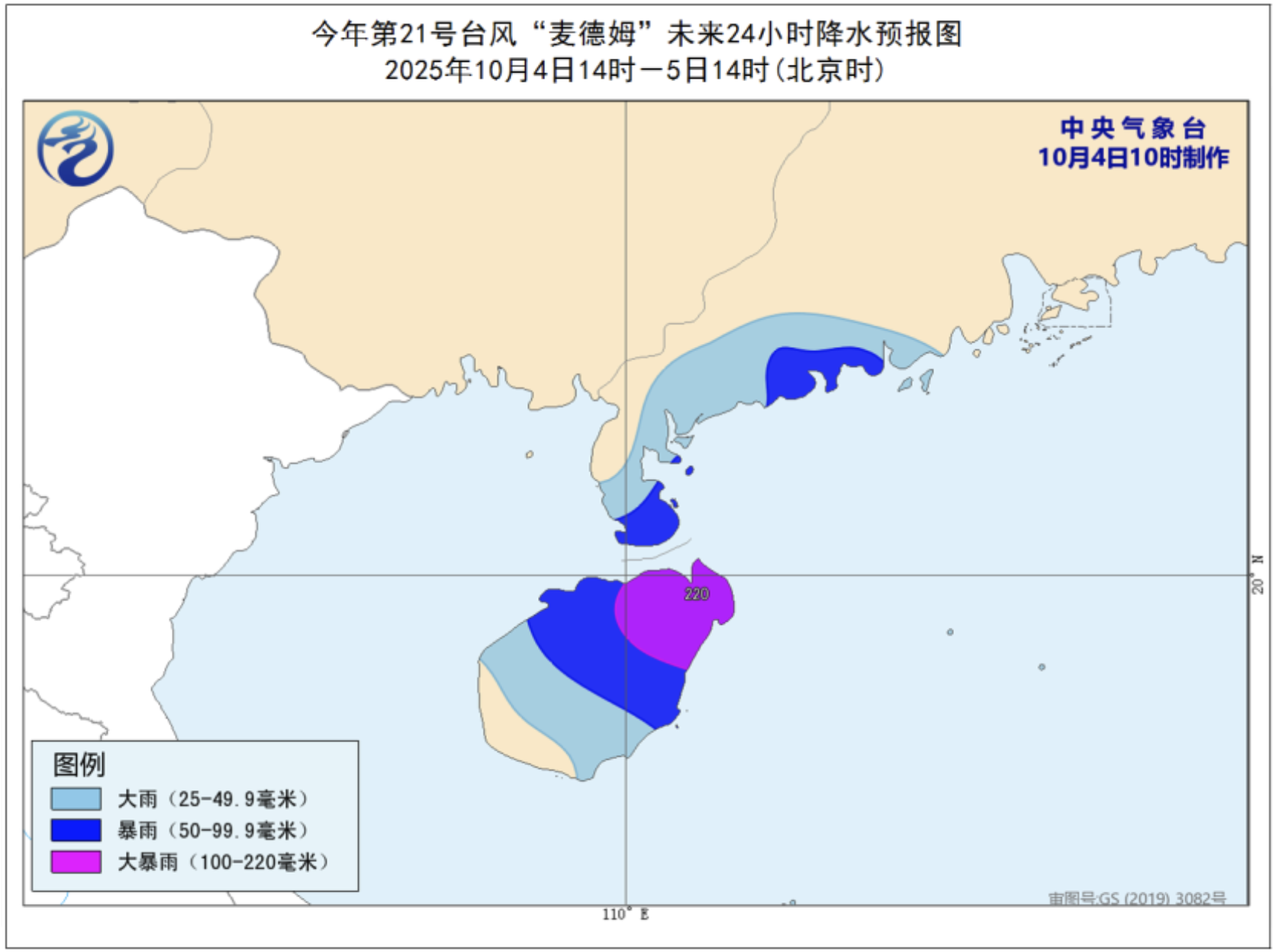 降水预报:4日14时至5日14时,海南岛中北部、广东西南部等地部分地区有大到暴雨,其中,海南岛东北部局地有大暴雨(100-220毫米)。