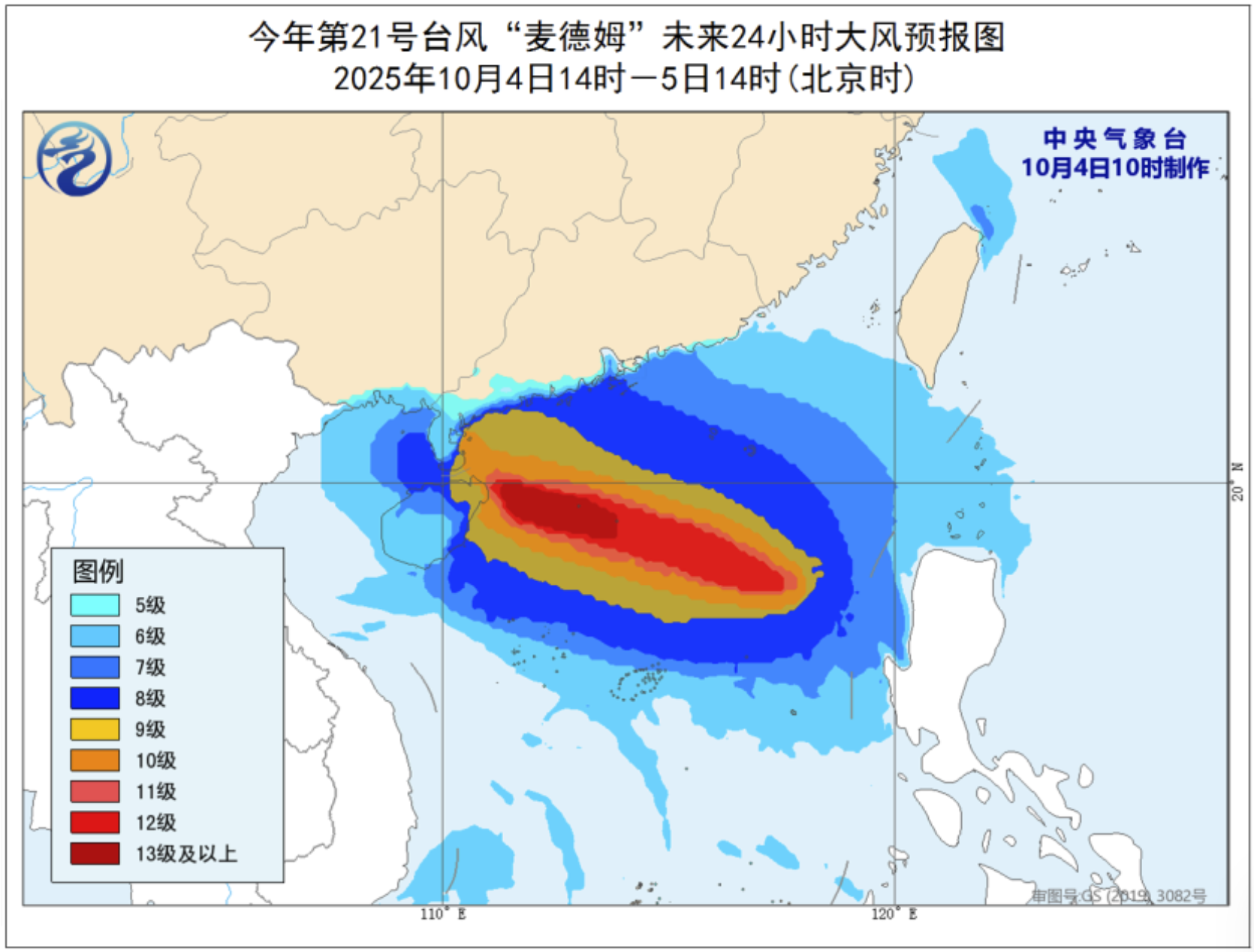 大风预报:4日14时至5日14时,巴士海峡、南海北部和中部海域、东沙群岛、西沙群岛、中沙群岛及黄岩岛附近海域、北部湾、琼州海峡、广西沿海、广东西南部及沿海、海南岛及沿海、台湾岛南部沿海有5-7级、阵风8-10级的大风,其中,南海西北部海域、琼州海峡、北部湾东部海域、广东西部沿海、海南岛东部和北部沿海的风力有8-11级,阵风12-13级,“麦德姆”中心经过的附近海域或地区风力可达12-14级,阵风15-16级。