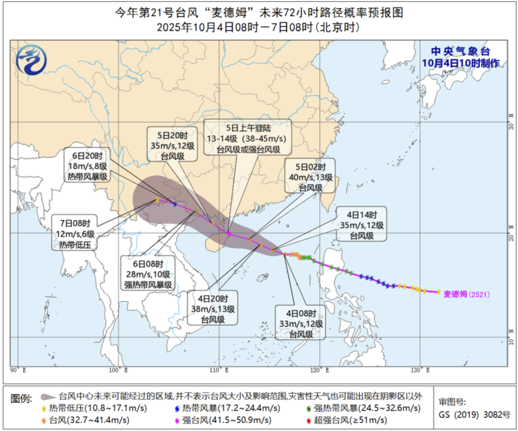 预计,“麦德姆”将以每小时25公里左右的速度向西偏北方向移动,强度逐渐增强,并向广东西部到海南岛东部一带沿海靠近,将于5日上午在广东电白至海南万宁一带沿海登陆(台风级或强台风级,13-14级,38-45米/秒),登陆后强度逐渐减弱。