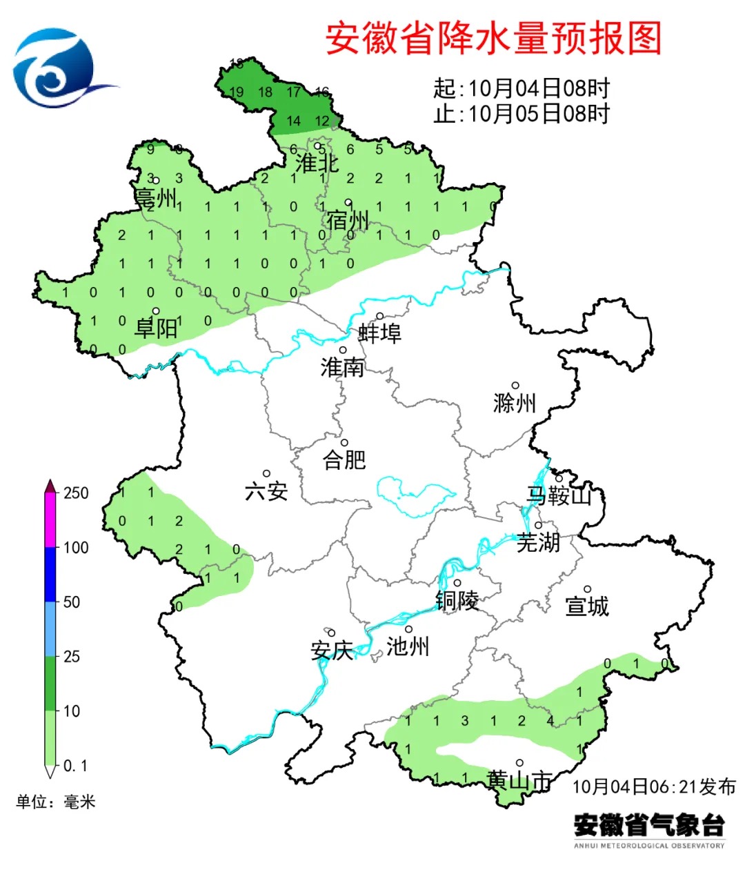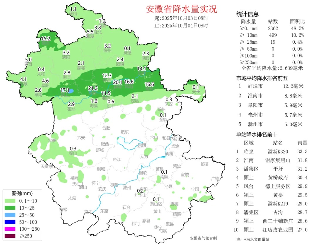 昨天沿淮淮北和大别山区出现阵雨或雷雨,其中沿淮地区中到大雨,最大临泉滁新K320站33.3毫米。