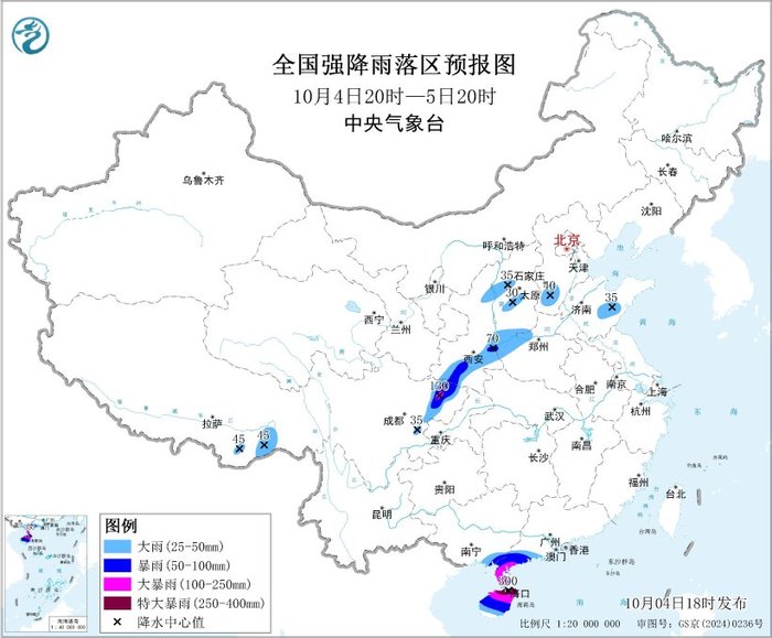 预计,10月4日20时至5日20时,海南岛大部、广东西南部、广西东南部等地先后有大到暴雨,其中,海南岛北部、广东西南部等地部分地区有大暴雨,局地特大暴雨(250~300毫米);此外,西藏东南部、四川盆地、陕西南部、河南西北部、山西中南部、河北南部、山东中南部等地部分地区有大雨或暴雨,四川盆地北部局地有大暴雨(100~130毫米);上述部分地区伴有短时强降水,最大小时降雨量20~40毫米,华南局地可超过80毫米。