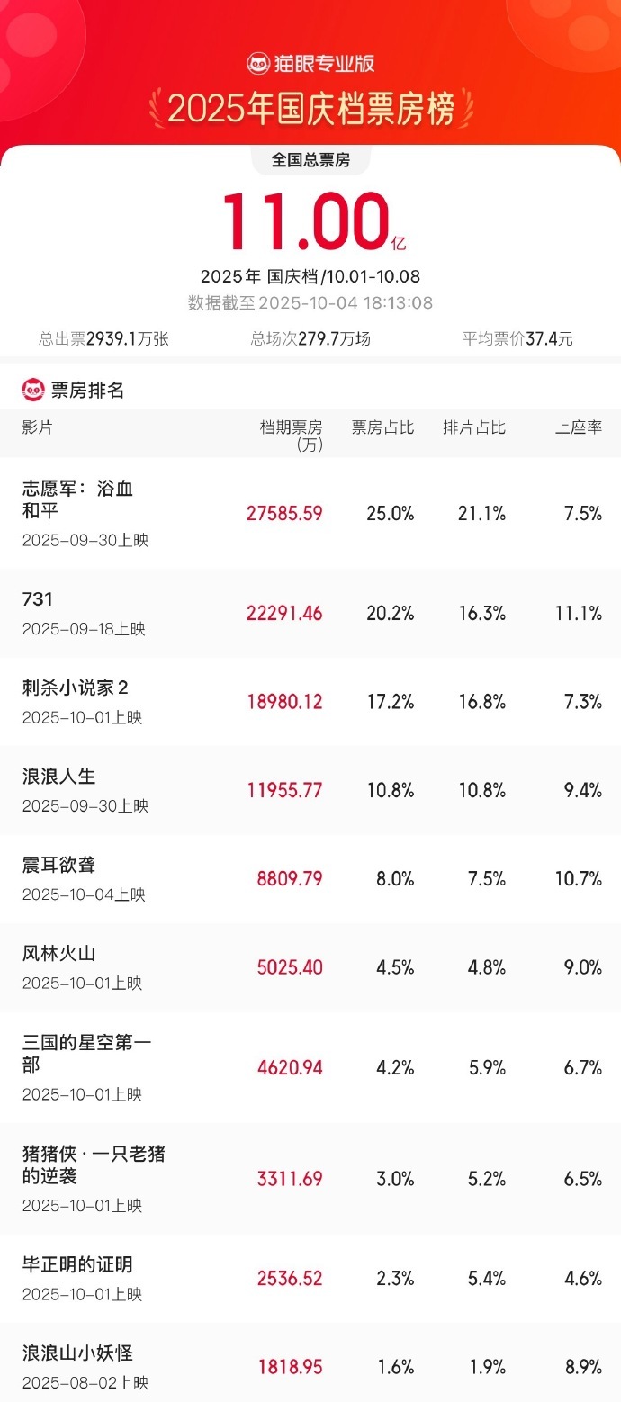 据猫眼专业版数据,截至10月4日18时13分,2025年国庆档档期票房破11亿,《志愿军:浴血和平》《731》《刺杀小说家2》分列前三位。