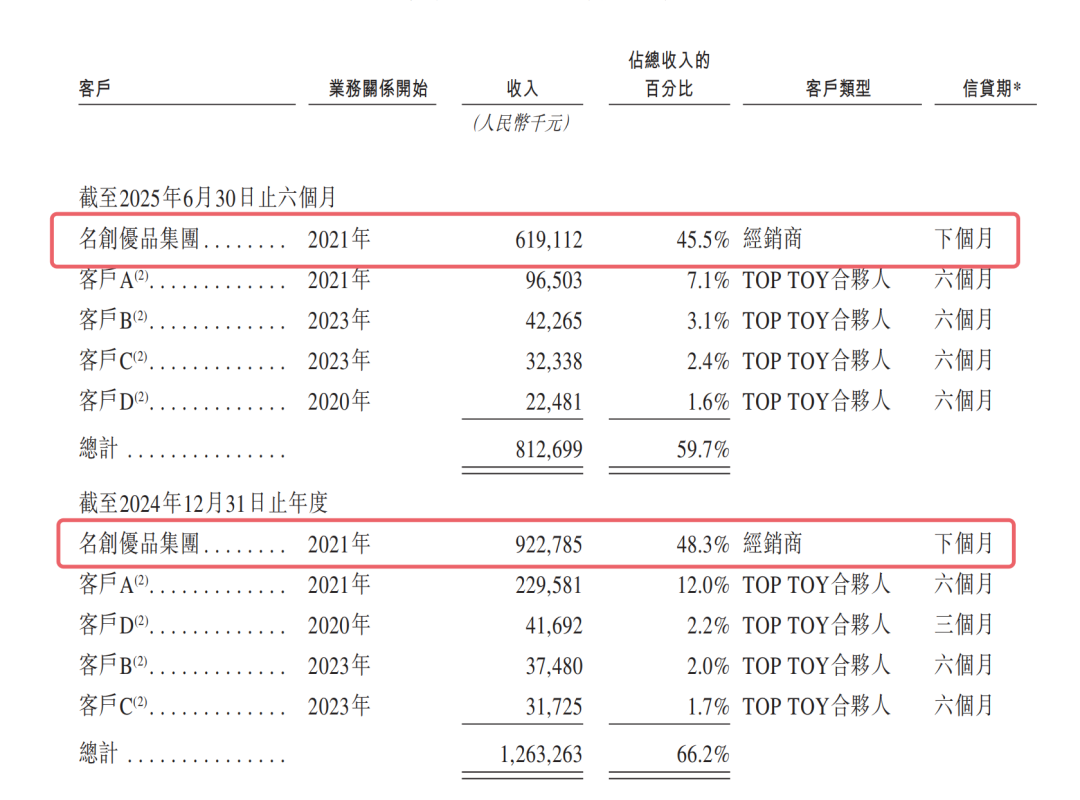 招股书显示,2022年~2024年,来自名创优品的收入分別为2.5亿元、7.8亿元、9.2亿元,分別占TOP TOY各期间总收入的36.8%、53.5%、48.3%。到2025年上半年,这一依赖症并没有减缓,来自名创优品的收入为6.2亿元,占比45.5%。