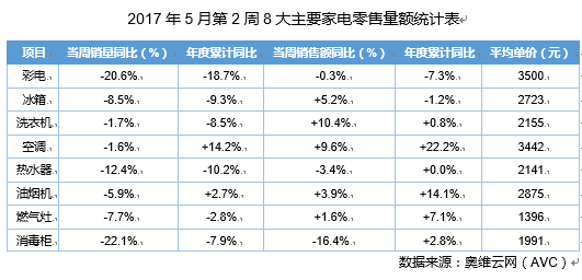 近日,奥维云网5·1后第二周8大主要家电零售数据在业内受到关注。数据显示,5·1后第二周8大主要家电零售量全部同比均出现下滑,给行业传递出一种不乐观的信号,难怪有人对2017年市场看淡。(见2017年5月第2周8大主要家电零售量额统计表)