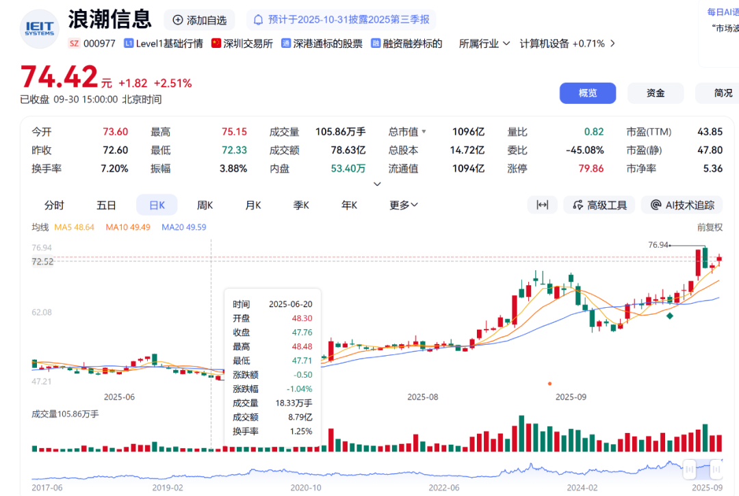 在国庆节前的最后一个交易日,浪潮信息股价上涨2.51%,市值涨至1096亿元。