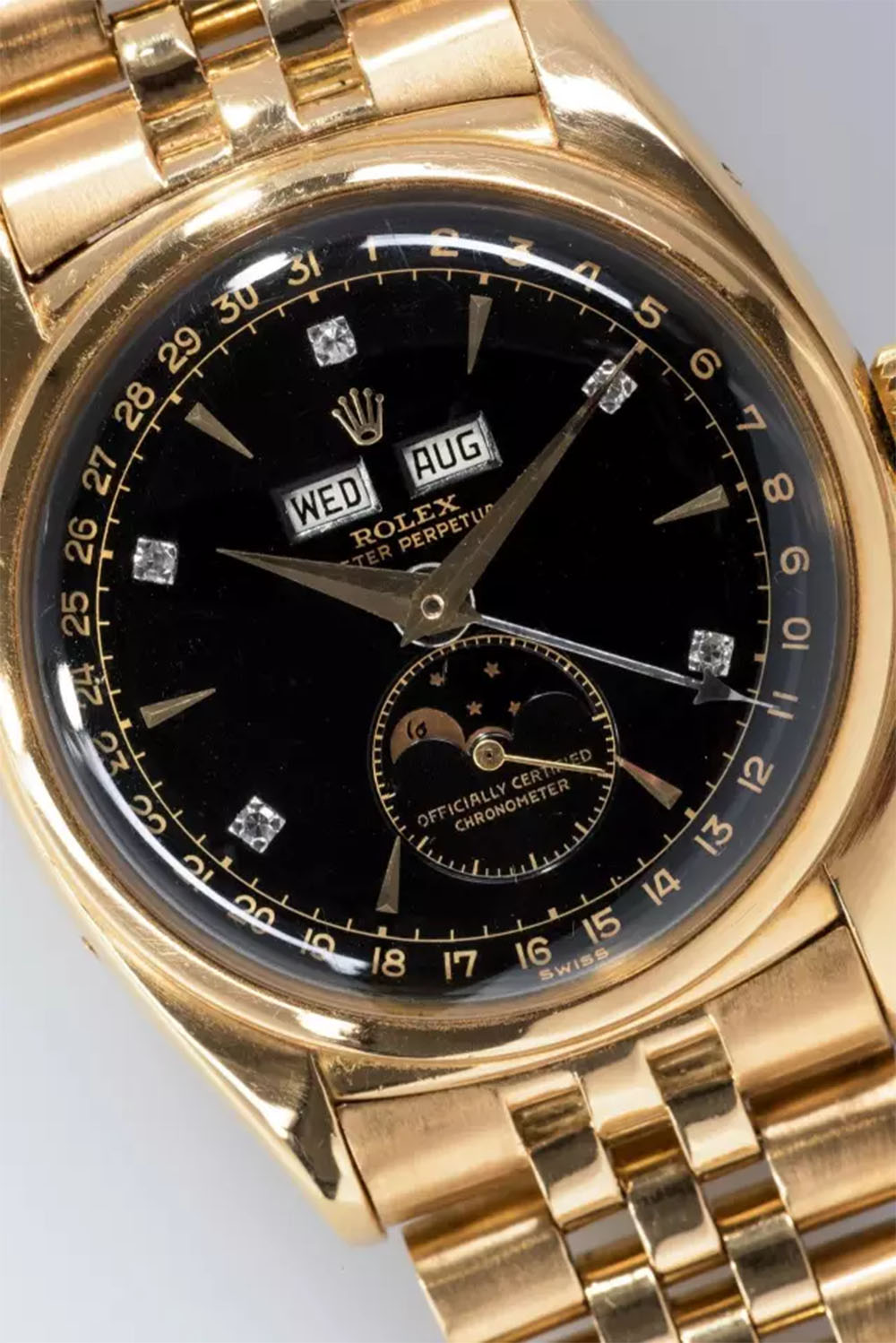 他来到钟表店,对店员说,“想要买一只劳力士最稀有珍贵的腕表”。最后,保大挑中了这款ref.6062:黄色18K金表壳,纪念型表链,黑色表盘装饰镶钻时标,12点下方是月份和星期窗口,表盘最外圈是日历指示功能。